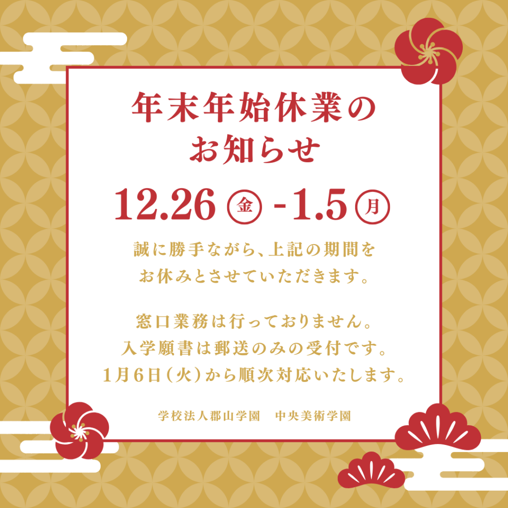 誠に勝手ではございますが、12月26日(金)~1月5日(月)は年末年始休業とさせていただきます。