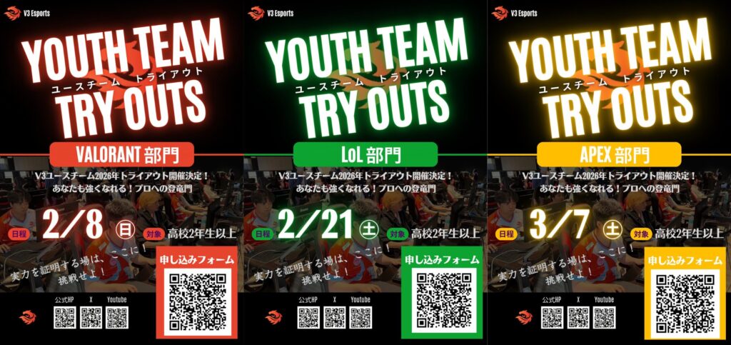 2026年 『V3Esportsユースチームトライアウト』の日程が決定いたしました👏!!